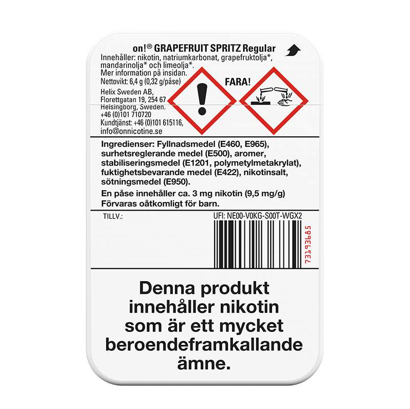 on! Grapefruit Spritz 3mg là sản phẩm nicotine pouch nhỏ gọn, sản xuất bởi Helix. Sản phẩm không chứa thuốc lá, thuộc loại snus trắng, mang đến hương vị tươi mát của bưởi kết hợp với vị nho trắng. Kích thước nhỏ gọn giúp sản phẩm dễ dàng sử dụng và không gây chú ý. Với thời hạn sử dụng khoảng 18 tháng, bạn có thể thưởng thức hương vị chua ngọt của on! Grapefruit Spritz bất cứ khi nào muốn.